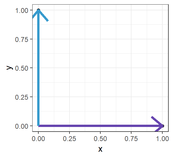 어떤 행렬에 벡터를 곱한다는 것은 벡터의 값의 변환을 의미합니다. 여기에서는 SVD를 이해하기 앞서, orthogonal matrix와 diagonal matrix가 어떤 벡터 변환을 행하는지 살펴보겠습니다. 간단한 예제와 함께 보겠습니다. $$M=\left.\begin{pmatrix}\cos\theta&-\sin\theta\\\sin\theta&\cos\theta\end{pmatrix}\right|_{\theta=\pi/2}, x=[1, 0]^{\top}$$ 위 $M$, $x$을 고려해보겠습니다. $M$은 널리 알려진 회전 행렬이며, $M^{\top}M=I_{2}$가 되는 orthogonal matrix입니다. 비약해서 설명하면 orthogonal matrix는 회전 행렬입니다. 이제 행렬에 벡터를 곱해 보면, $$Mx=\begin{pmatrix}\cos\frac{\pi}{2}&-\sin\frac{\pi}{2}\\\sin\frac{\pi}{2}&\cos\frac{\pi}{2}\end{pmatrix}\begin{pmatrix}1\\0\end{pmatrix}=[0, 1]^{\top}$$ 벡터 $x$를 90도 회전 시킴을 확인할 수 있습니다.