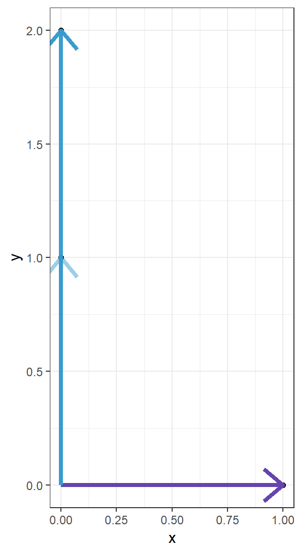 Diagonal matrix는 조금 특이한 형태로 벡터 변환을 합니다. 다음의 Diagonal Matrix를 생각해보겠습니다. $$D=\begin{pmatrix}1&0\\0&2\end{pmatrix}$$ 그리고 이어서 아까 구한 $Mx$ 앞에 곱한, 즉, $DMx$는 다음과 같습니다. $$DMx=[0,2]^{\top}$$ 벡터의 진행방향은 바뀌지 않고, $x$ 방향으로 1배, $y$ 방향으로 2배 크기만 바뀌었다는 사실을 알 수 있습니다.