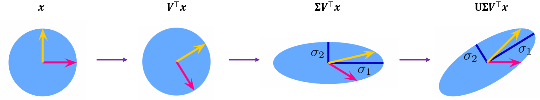 행렬 $M$가 $U\Sigma V^{\top}$로 SVD된 것을 고려해보겠습니다. 행렬 $M$에 벡터 $x$를 곱해, $Mx=U\Sigma V^{\top}x$, SVD가 기하학적으로 어떤 의미를 지니는지 순서대로 살펴보면 다음과 같습니다.
