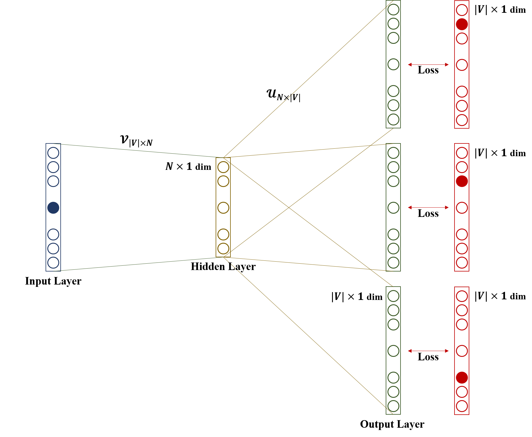 - (Loss) $\hat{y}$를 context의 one-hot vector인 각 $y^{(c)}$와 오차를 측정합니다.