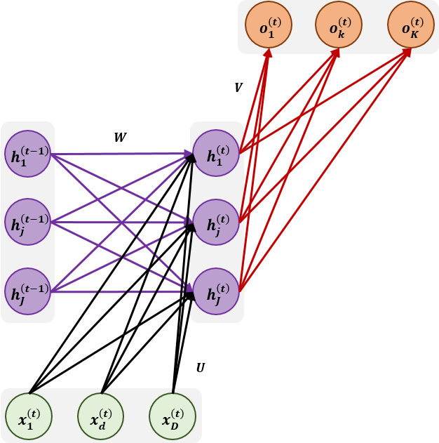 위 내용을 일반화해보겠습니다 $x$, $h$, $o$가 의미하는 바는 위와 같고, $x\in\mathbb{R}^{D}$, $h\in\mathbb{R}^{J}$, $o\in\mathbb{R}^{K}$, 즉, 각각의 노드의 수가 $D$, $J$, $K$인 상황입니다. 따라서 가중치 행렬의 차원은 $U\in\mathbb{R}^{J\times D}$, $W\in\mathbb{R}^{J\times J}$, $V\in\mathbb{R}^{K\times J}$가 됩니다. 도식화해보면 아래와 같습니다.
