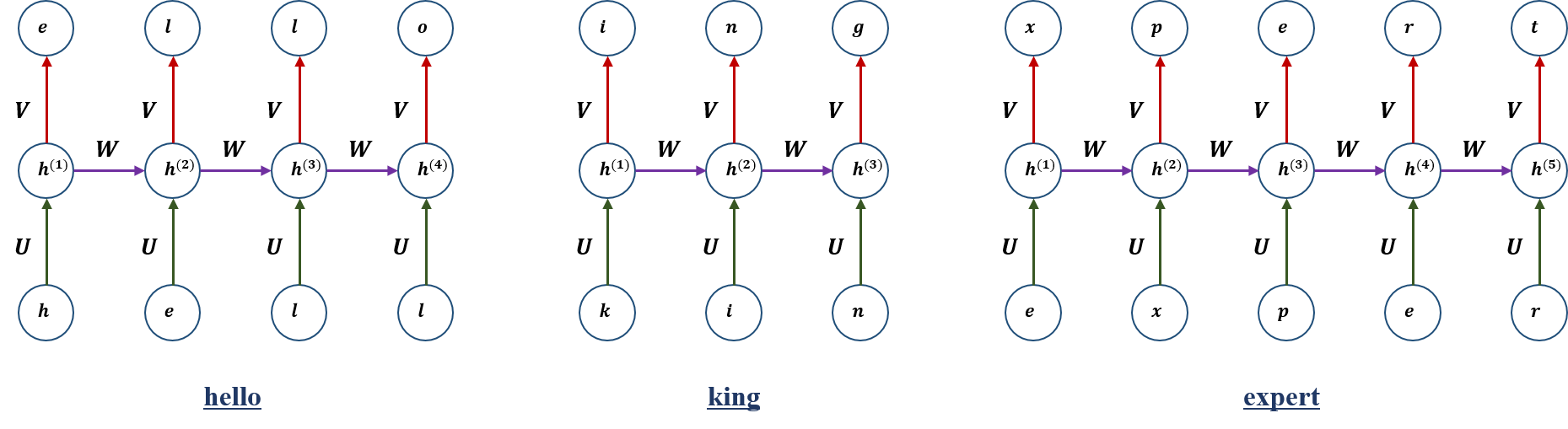 시간의 길이 $T$에 유연하다는 것은1개의 모형으로 hell의 o를, kin의 g를, exper의 t를 예측가능하다는 것 입니다. 어짜피 같은 가중치를 곱해주고, 은닉층에 단어의 과거 정보가 포함되어 있어, 위 예제 단어의 길이 5, 4, 6에 무관하게 같은 모형을 적용시킬 수 있습니다.