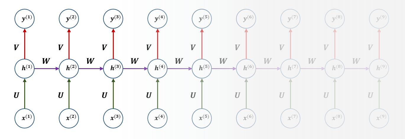 출력층 계산은 RNN과 동일합니다. 도안은 제시하지 않고 수식만 작성해보면 다음과 같습니다. $$\hat{y}^{(t)}=softmax\left(Vh^{(t)}\right)$$