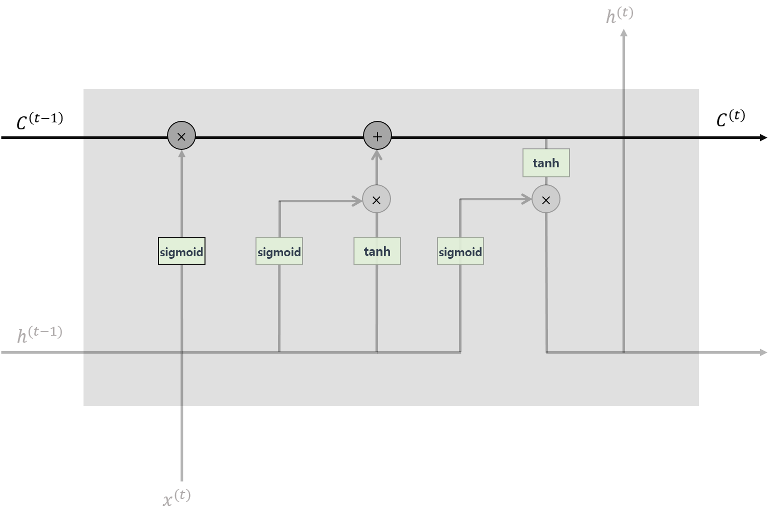 LSTM의 핵심 아이디어는 이전 단계의 정보를 memory cell에 저장하여 흘려보내는 것입니다. 현재 시점의 정보를 바탕으로 과거의 내용을 얼마나 잊을지 곱해주고, 그 결과에 현재의 정보를 더해서 다음 시점으로 정보를 전달합니다. 그러면 이어서 어떤 것을 곱하고, 더해주는지 자세히 살펴보도록 하겠습니다.