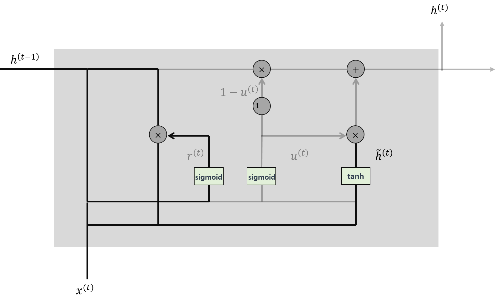 LSTM과 구조상 큰 차이도 없고, 분석결과도 큰 차이가 없는 것으로 알려져있습니다. 분석 결과가 큰 차이가 없다는 것은 같은 목적에서 성능상의 큰 차이가 없다는 의미가 아니라, 주제별로 LSTM이 좋기도, GRU가 좋기도 하다는 의미입니다. 다만 GRU가 학습할 가중치가 적다는 것은 확실한 이점입니다. 아마 LSTM을 보고오셨다면 쉽게 이해하셨을거라고 생각합니다. 마지막으로 수식을 한 군데 모으며 포스팅을 마치겠습니다 :) $$\begin{align*}r^{(t)}&=\sigma\left(W_{r}h^{(t-1)}+U_{r}x^{(t)}\right)\\u^{(t)}&=\sigma\left(W_{u}h^{(t-1)}+U_{u}x^{(t)}\right)\\\tilde{h}^{(t)}&=\tau\left(Wh^{(t-1)}*r^{(t)}+Ux^{(t)}\right)\\h^{(t)}&=(1-u^{(t)})*h^{(t-1)}+u^{(t)}*\tilde{h}^{(t)}\end{align*}$$