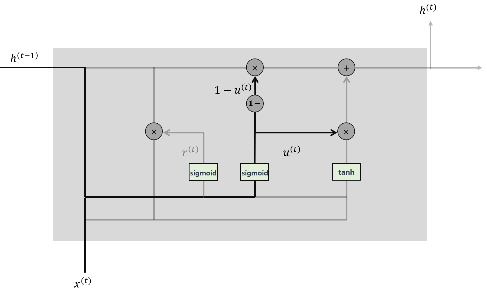 수식으로 정리하면 아래와 같습니다. $$h^{(t)}=(1-u^{(t)})*h^{(t-1)}+u^{(t)}*\tilde{h}^{(t)}$$