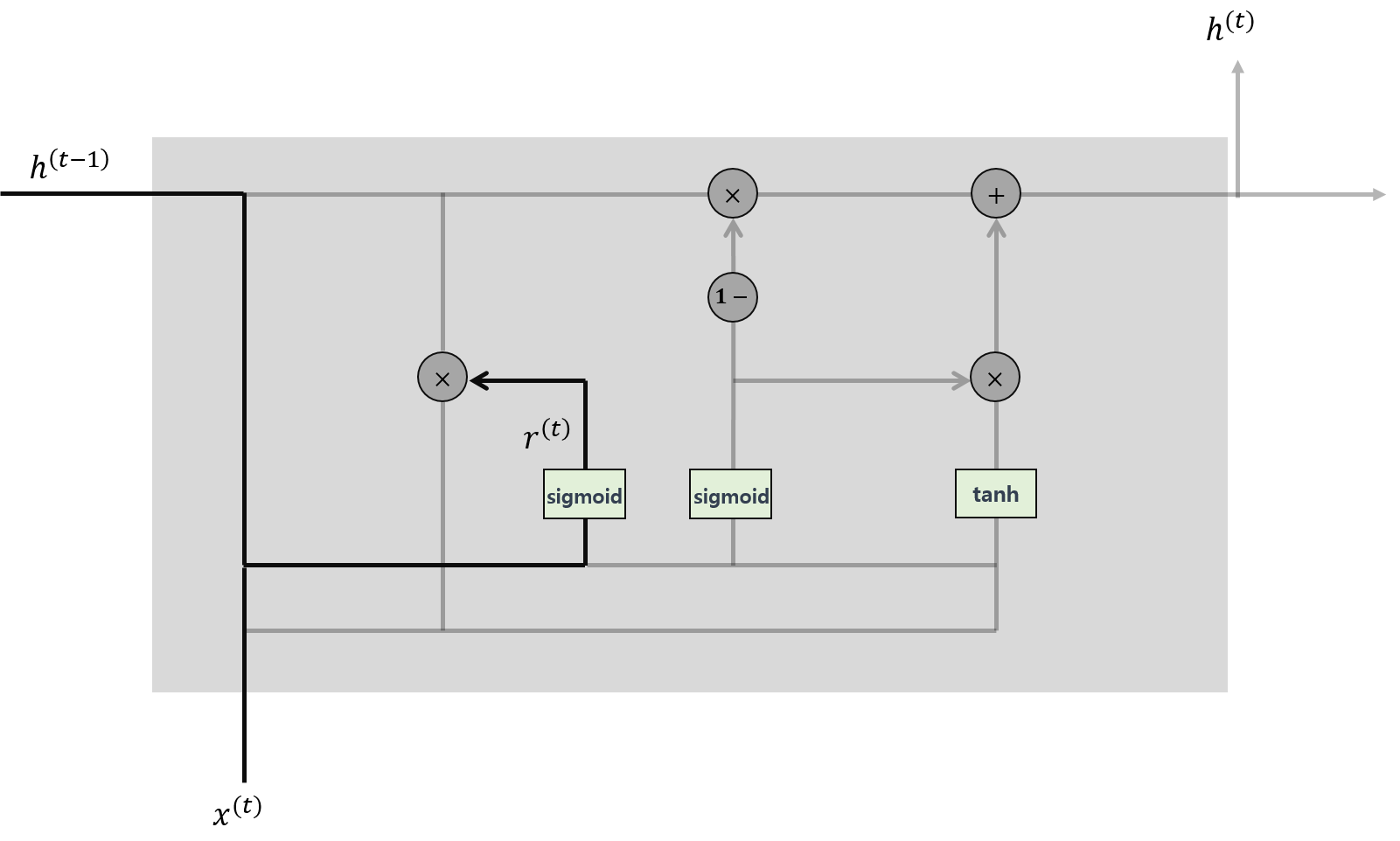 수식으로 나타내면 다음과 같습니다. $$\tilde{h}^{(t)}=\tau\left(Wh^{(t-1)}*r^{(t)}+Ux^{(t)}\right)$$ 여기에서 $\tau$는 tangent hyperbolic이고, $*$은 pointwise operation입니다.