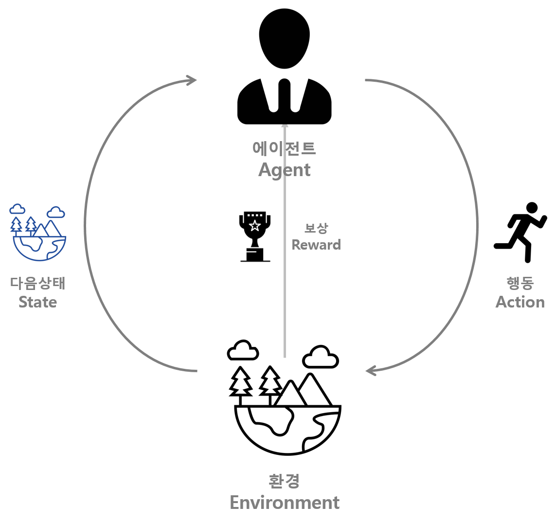 에이전트는 정답을 알 수 없는 환경에 놓여있습니다. 그 환경 안에서 어떤 행동을 하면 환경은 에이전트에게 적절한 보상을 해주고, 다음 상태가 어떤지를 전달해줍니다. 상호작용이 무한히 반복되어 에이전트는 보상을 최대로 얻기위해 노력하면서 강화된다고 할 수 있습니다.