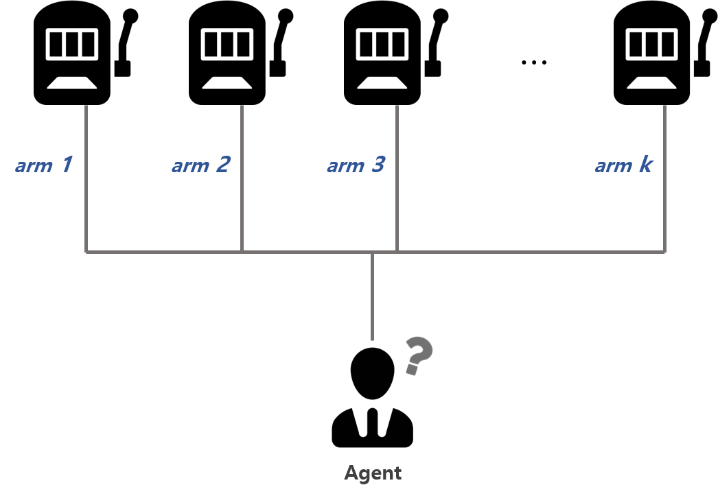 MAB는 위 상황으로부터 출발합니다. k개의 슬롯머신이 있는데 에이전트는 각 시도 마다, k개중 단 1개의 슬롯을 당겨 최종적으로 최고의 보상을 얻고 싶은 상황을 말합니다. 다시 말하면 에이전트가 1000번의 게임을 하는데 최대 보상을 얻기위해 1000번을 어떻게 당겨야할까를 푸는 문제입니다. 이러한 문제를 k-armed bandit problem이라고하며 MAB도 결국 같은 말입니다. 이렇듯 MAB의 시작은 슬롯머신의 보상을 최대화지만, 당연하게도 많은 상황으로 확장가능합니다.