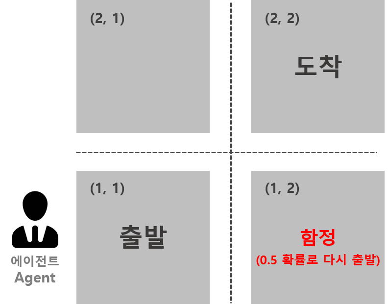 상태전이확률을 예제와 함께 이해해보겠습니다. 아래는 $2\times 2$ 크기의 미로찾기문제입니다. 에이전트는 시작지점에서 출발하여 도착지점까지 도달하면됩니다. 이 미로는 좌, 우, 아래, 위 방향으로만 이동가능합니다. 즉, $\mathcal{A}=\{\leftarrow, \rightarrow, \downarrow, \uparrow\}$라는 말과 동일합니다. 또한 도착지점에 도달할 경우는 1의 보상을 받고, 함정 칸에서 출발지점으로 돌아가면 보상이 -2, 이를 제외한 나머지 모든 움직임에서는 보상이 -1입니다. 달리 말하면, $\mathcal{R}=\{-2,-1,1\}$인 것 입니다. 마지막으로 각 네모는 상태를 말합니다. 마찬가지로 요약해보면 $\mathcal{S}=\{(1,1),(1,2),(2,1),(2,2)\}$ 에이전트는 낭떠러지가 있음을 자각한다고 가정하겠습니다. (예를 들어 (1,1) 지점에서는 위, 오른쪽 방향으로만 이동가능합니다.)