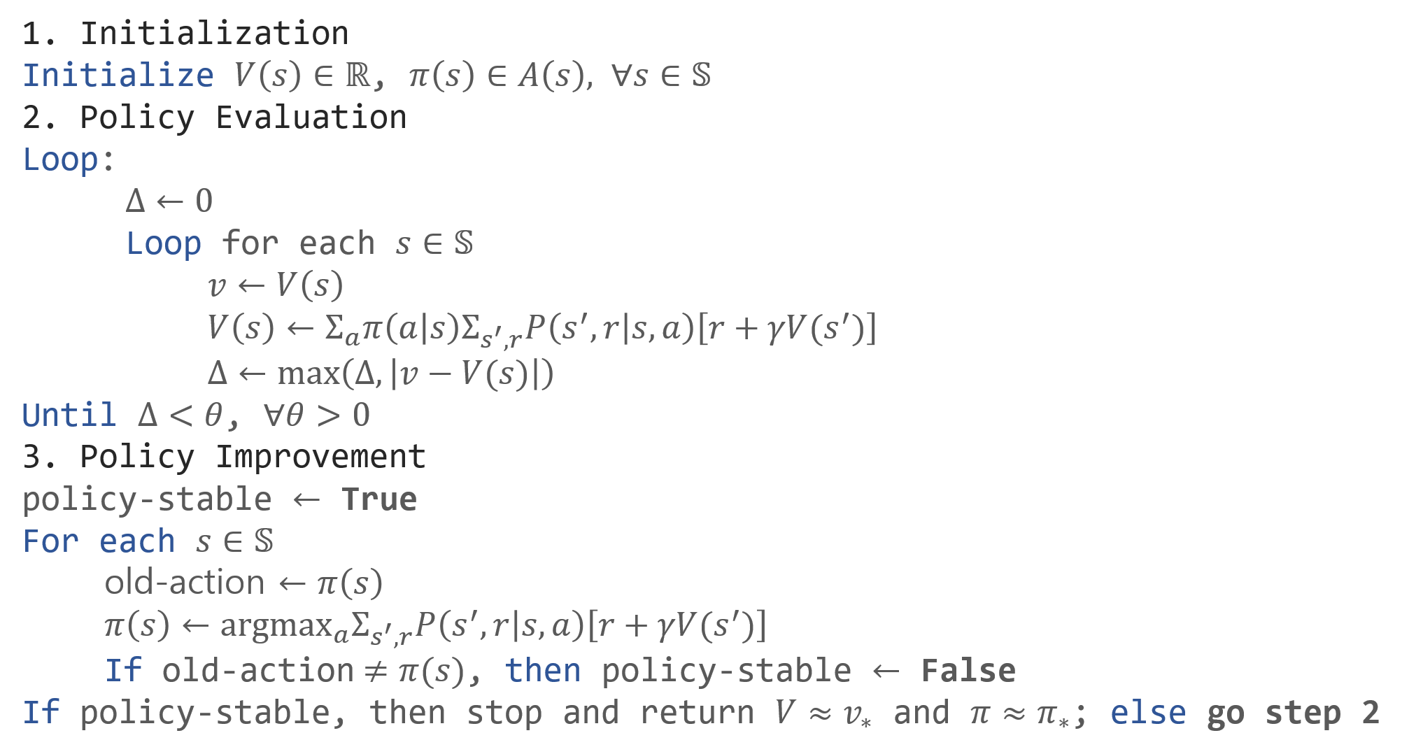 정책 반복은 앞서 다룬 정책 평가와 개선을 반복하는 방법입니다. 이를 수식화 하면 다음과 같습니다. $$\pi_{0}\stackrel{E}{\longrightarrow}v_{\pi_{0}}\stackrel{I}{\longrightarrow}\pi_{1}\stackrel{E}{\longrightarrow}v_{\pi_{1}}\stackrel{I}{\longrightarrow}\cdots\stackrel{I}{\longrightarrow}\pi_{*}\stackrel{E}{\longrightarrow}v_{*}$$ 여기에서 $E$는 평가(Evaluation)을, $I$는 개선(Improvement)을 의미합니다. 이런식으로 단순히 평가와 개선을 반복하는 방법을 정책 반복 (Policy Iteration)이라고 부릅니다. 이를 pseudocode로 나타내보면 아래와 같습니다.