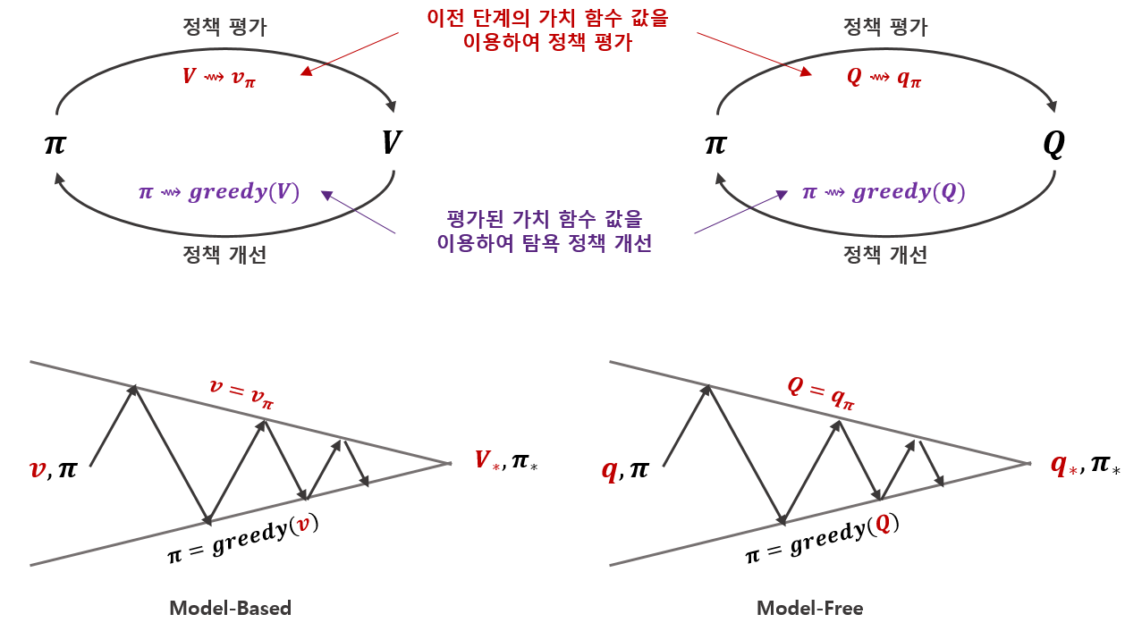정책 평가는 이전 정책과 현재 정책이 같아야 안정될 것이고, 정책 개선은 현재 가치함수의 탐욕 정책이 이전 정책과 같아야 안정 될 것입니다. 결국 벨만의 최적 방정식을 푸는 것과 같은 의미가 됩니다. 정책 평가와 개선은 동시에 이루어 질 수 없기 때문에 각각을 개선해가며 최적 정책 및 가치함수에 도달해 가는 것입니다.