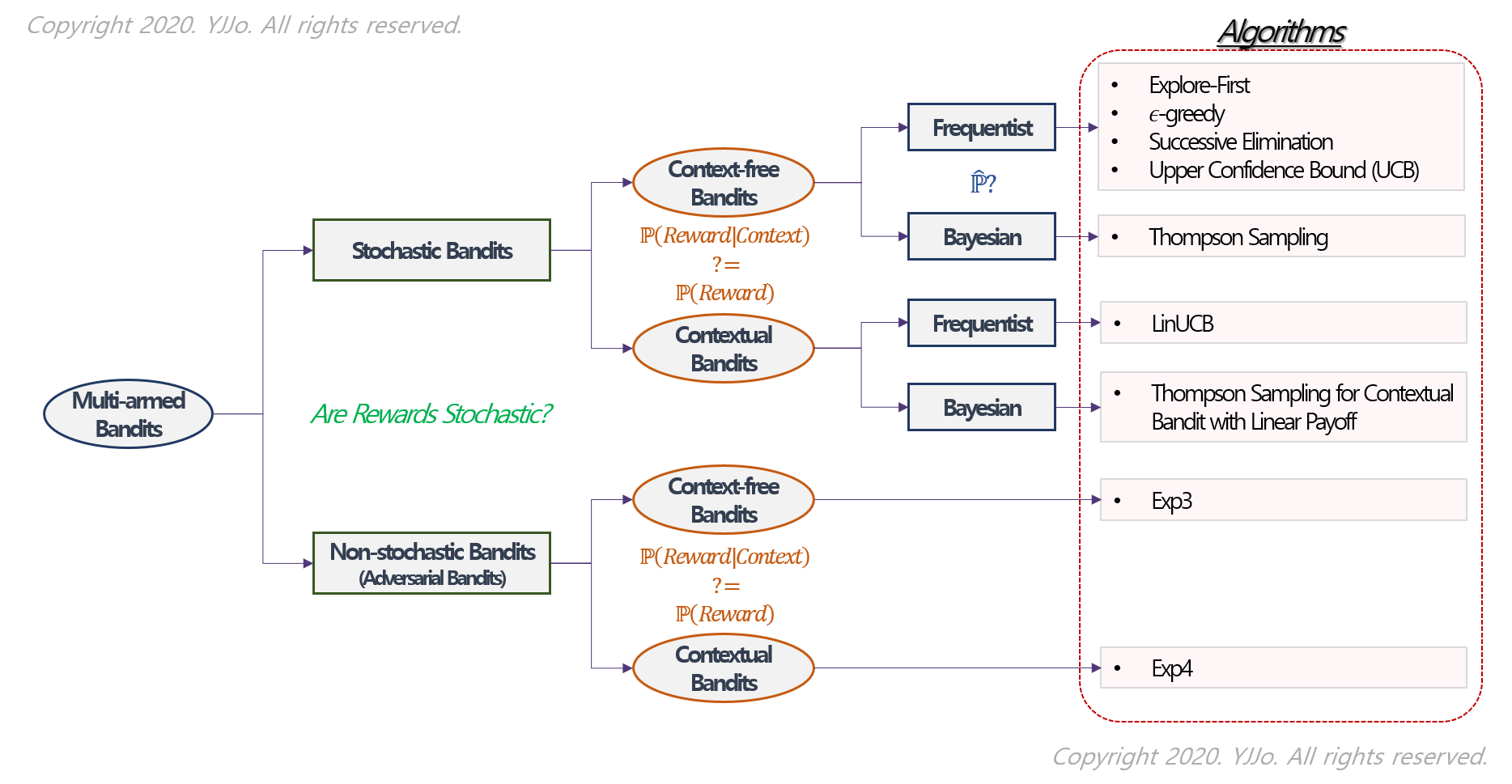 앞서 말씀드린것 처럼 reward를 해석하는 방법은 MAB 알고리즘을 이해하는데 key point가 됩니다. 제 나름대로 MAB를 분류해둔 것으로 아래내용이 모든 Algorithm을 커버하진 않지만, 핵심은 모두 담고자 노력했습니다.