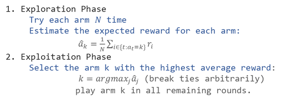 가장 naive한 접근 방법은 Explore-First Algorithm입니다. 이름 그대로 먼저 explore를 한 다음에 이후엔 exploit만 하는 알고리즘입니다.