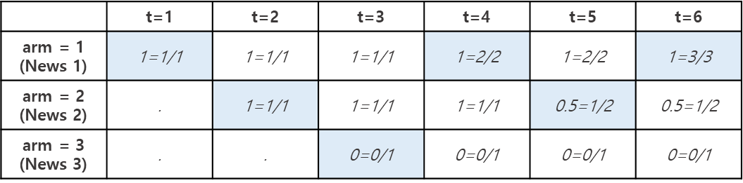 위 표에서 t는 각 round를 의미하고, 파란색 음영이 칠해진 것이 각 라운드에서 선택한 arm입니다. 1 라운드에서는 News 1을 노출했고, 클릭을 했기 때문에 (클릭)/(누적 노출 건수)로 각 news의 평균 reward를 예측할 수 있습니다. 반복하여 6라운드에 도달했을 땐, News 1의 평균 반응은 1이되고, News 2, 3은 각각 0.5, 0이 됩니다.