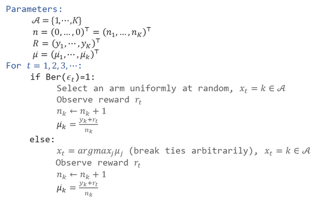 위 알고리즘을 살펴보면 $\epsilon_{t}$라고 되어있습니다. 즉 매라운드별로 값이 다르게하는 것도 가능하다는 것 입니다. 가장 기본적인 ε-greedy에서는 $\epsilon_{t}$를 상수로 고정하지만, 초반에는 값을 크게하고, 후반부로 갈수록 값을 점점 감소시키는 design도 가능합니다.