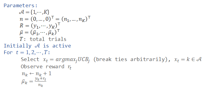 Figure 3에서 $UCB_{j}=\bar{\mu}_{n_{j}}(j)+r_{n_{j}}(j)$, $r_{n_{j}}(j)=\sqrt{\frac{2\log{T}}{n_{j}}}$를 일컫습니다.