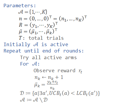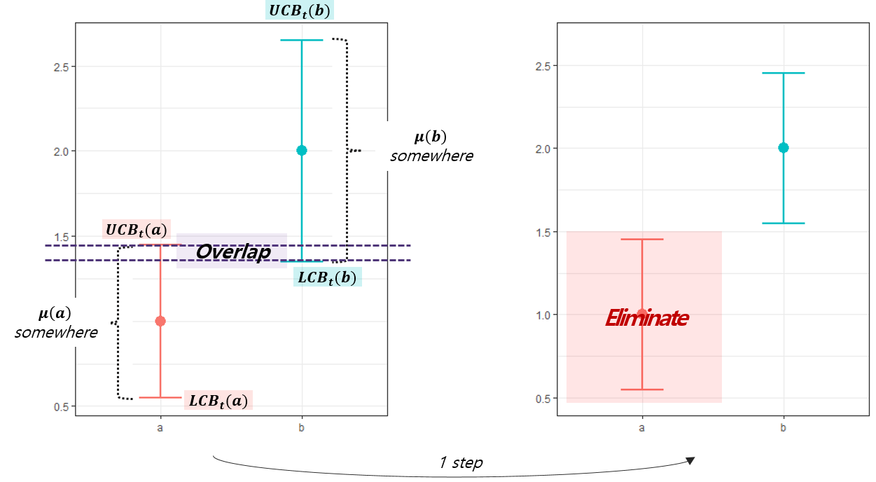 Figure 1은 a, b 2개 arms을 고려했을때, 어떤 arm의 UCB보다 큰 다른 arm의 LCB가 존재할때 해당 arm을 제거하고, 아닌 경우에는 계속해서 교차선택하는 알고리즘을 생각할 수 있습니다. 이렇게 하면 점점 confidence interval의 길이가 짧아지면서 최종적으로 좋은 arm이 남게됩니다. 즉 이전의 결과가 반영된 adaptive exploration이 됩니다.