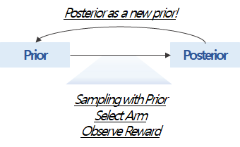 Thompson Sampling은 Prior, Posterior의 관계를 이용하여 각 라운드별 최적의 arm을 선택하는 algorithm입니다.