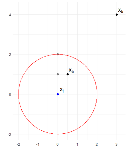 Reachability Distance는 주어진 데이터로부터 k-neiborhood의 데이터내에 있을 경우 거리를 같게 아닌 경우는 실제 거리를 측도하는 방법입니다. $$\text{RD}\left(x_{i},x_{j}\right)=max\left[\text{k-distance}\left(x_{j}\right), dist.\left(x_{i},x_{j}\right)\right]$$여기에서 $\text{k-distance}(x_{j})$는 $x_{j}$와 $k$번째 가까운 데이터와의 거리를 의미하며, distance는 세간의 어떤 distance라도 적용할 수 있습니다. Euclidean Distance를 가정해보면 아래와 같은 직관적인 상황을 생각해 볼 수 있습니다. ($k=3$을 가정합니다.)
