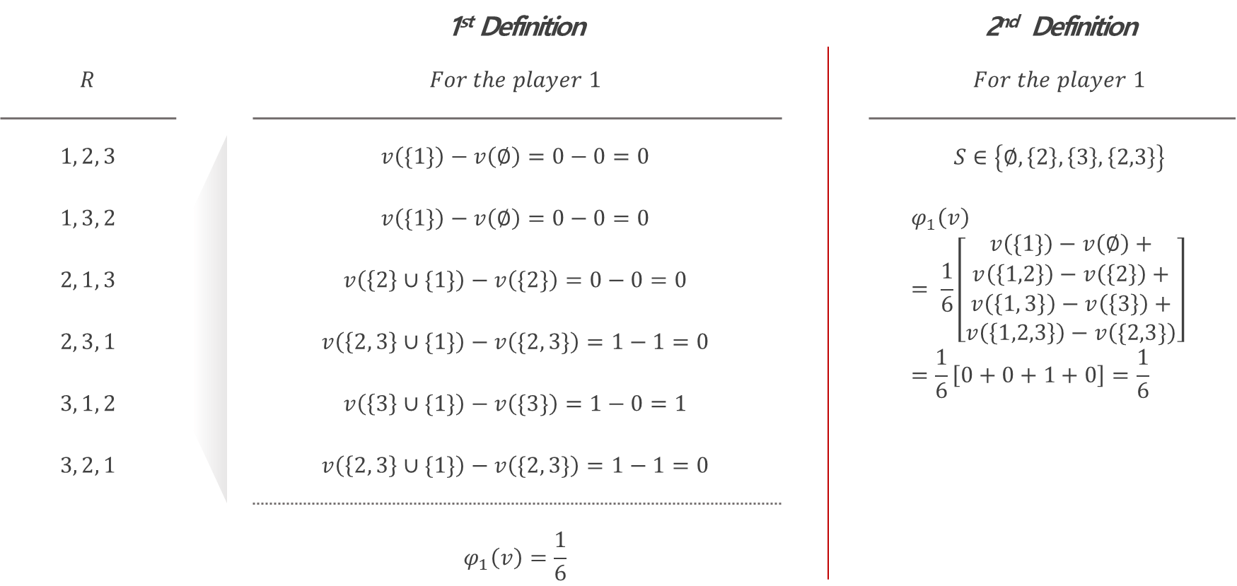 Shapley value는 fair distribution의 solution 중 하나입니다. $R$을 $|N|=n$명의 player의 순서로, $P_{i}^{R}$은 $R$의 순서에서 $i$ 앞에 배치된 player의 순서로 정의하겠습니다. 예를 들어, 5명의 player가 있다면, $R=\{1,3,2,5,4\}$가 순서중 하나라면 $P_{2}^{R}=\{1,3\}$을 의미합니다. Shapley value는 아래와 같습니다. $$\varphi_{i}(v)=\frac{1}{|N|!}\sum_{R}\left[v(P_{i}^{R}\cup \{i\})-v(P_{i}^{R})\right]$$즉, $|N|!$의 순서 순열에 대하여 $i$의 모든 기여도를 계산한 뒤 산술평균을 구한 것과 같습니다. 보통 Shapley value에 대한 정의를 찾아보면 위와 같이 정의된 case는 많이 없습니다. 만약 $P_{i}^{R}\in S$, $S\subset N-\{i\}$라면, $v(P_{i}^{R}\cup\{i\})-v(P_{i}^{R})\in v(S\cup\{i\})-v(S)$를 만족합니다. 그러면 우리는 player의 배치를 이렇게 생각할 수 있습니다.$$\left[S, \{i\}, N-S-{i}\right]$$ 즉 $i$ player를 제외한 $S$ coalition의 player와 나머지 player ($N-S-\{i\}$)의 순서로 배치 됩니다. 각 집합을 섞는다고 생각해보면, $|S|!\times 1 \times (|N|-|S|-1)!$의 경우의 수가 생깁니다. 그러면 우리는 Shapley value를 아래와 같이 다시 정의할 수 있습니다.$$\varphi_{i}(v)=\sum_{S\subset N-\{i\}}\frac{|S|!(|N|-|S|-1)!}{|N|!}\left[v(S\cup \{i\})-v(S)\right]$$ 정의된 Shapley value는 위 다섯 가지 성질을 만족하며 이는 증명가능합니다. (이번 블로그에서는 증명 과정은 생략하겠습니다.)
