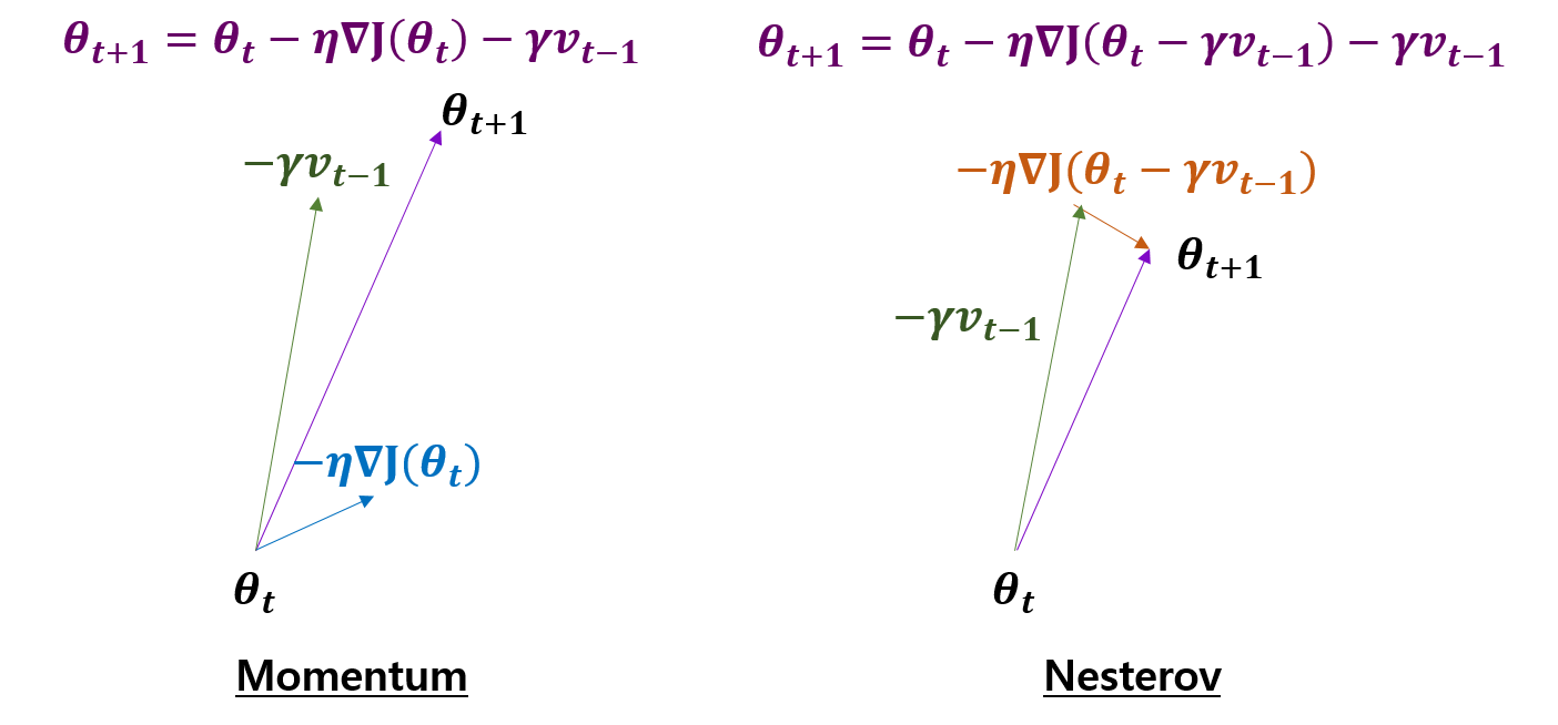 NAG는 가중치($\theta$)에 모멘텀이 반영된 기울기 만큼 이동($\gamma v_{t-1}$)했을 때, 이동분 $\theta-\gamma v_{t-1}$만큼을 반영해 주는 방법입니다. 즉 현재 위치에서의 기울기가 아닌 미래 위치(근사치)의 기울기를 반영한 방법입니다. $$\begin{align*}v_{t}&=\gamma v_{t-1}+\eta \nabla_{\theta} J(\theta-\gamma v_{t-1})\\\theta&=\theta-v_{t}\end{align*}$$ 모멘텀 방법과 마찬가지로 $\gamma=0.9$로 설정해주는 것이 좋다고 알려져 있습니다. 이를 모멘텀 방법과 비교하여 도식화하면 다음과 같습니다.