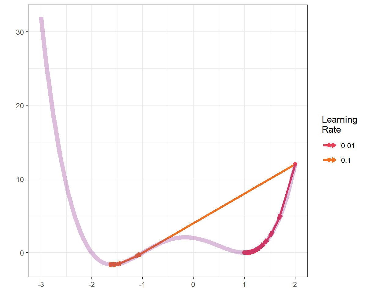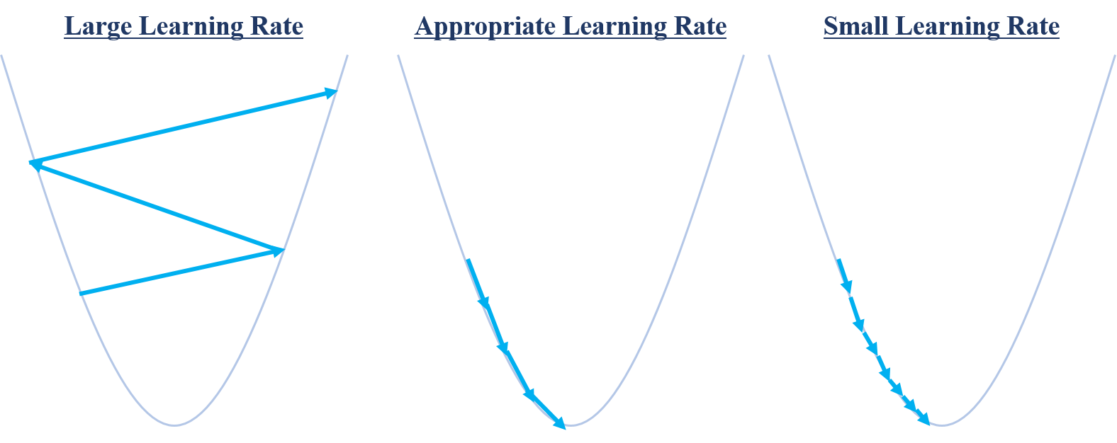 어떤 함수 $f$의 국소 최소값을 찾기 위한 기울기 강하법은 $$x^{(k+1)}\leftarrow x^{(k)}-\gamma_{k}\frac{\partial f(x^{(k)})}{\partial x^{(k)}}$$입니다. 여기서 $\gamma_{k}$는 learning rate 혹은 step-size라고 불리우는데 기울기의 역방향으로 $x$를 이동할 크기를 조정하는 역할을 합니다.