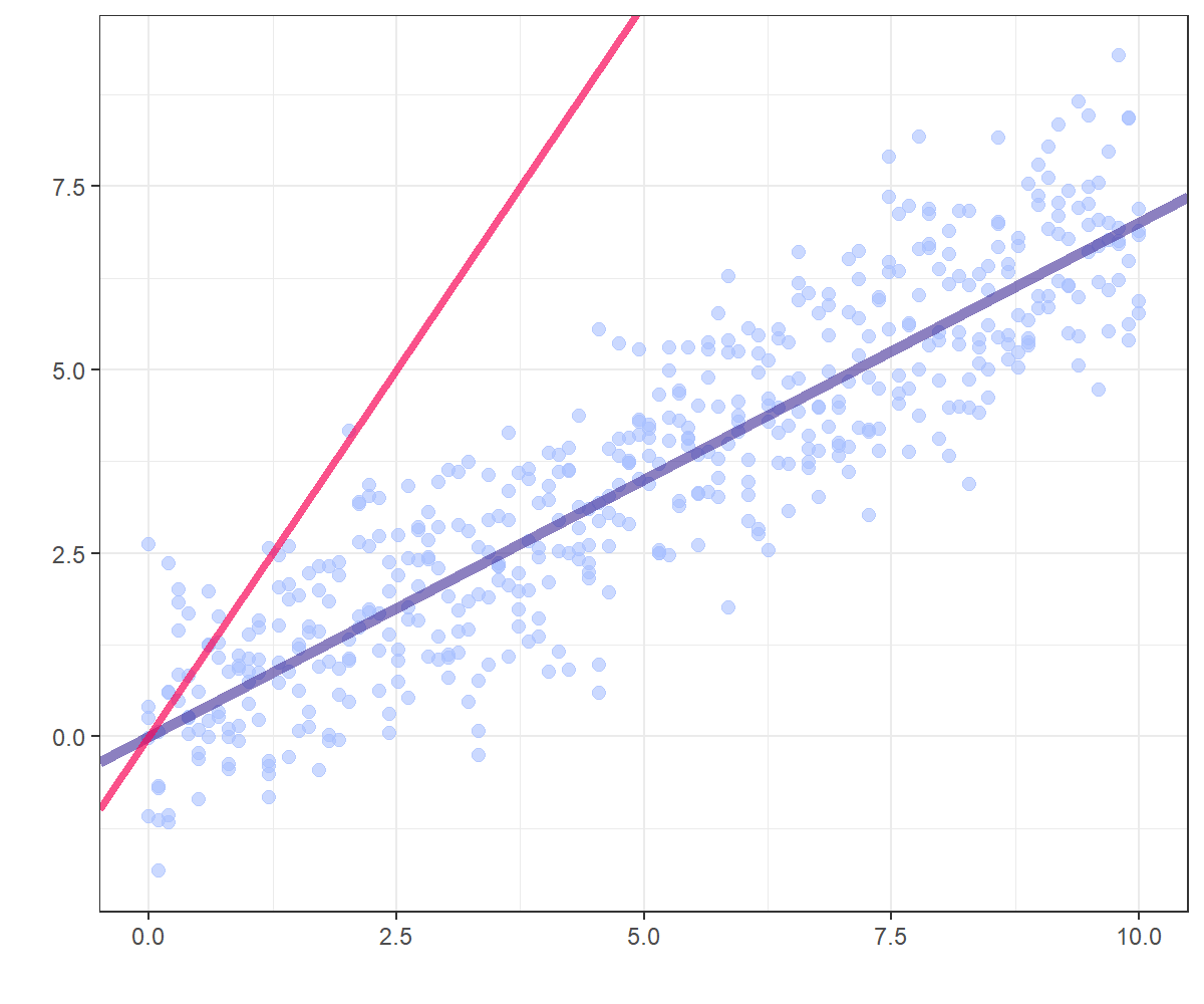 절편이 없는 회귀직선 $y=0.7x+\epsilon$, $\epsilon\sim N(0,1)$을 고려하겠습니다. 다시 말해서 $y=\beta x$의 $\beta$를 기울기 강하법으로 추정해보겠습니다. 즉 MSE 손실함수 $$\sum_{i=1}^{N}\left(y-\beta x\right)^{2}$$를 최적화하는 방법입니다. 최적화의 대상인 $\beta$의 기울기는 $$-\sum_{i=1}^{N}x(y-\beta x)$$가 되며, 기울기 강하법의 학습률 0.02를 적용한 update rule은$$\beta\leftarrow\beta+0.02\sum_{i=1}^{N}x(y-\beta x)$$가 됩니다. 회귀직선의 관점에서 살펴보면 Figure 5와 같습니다.