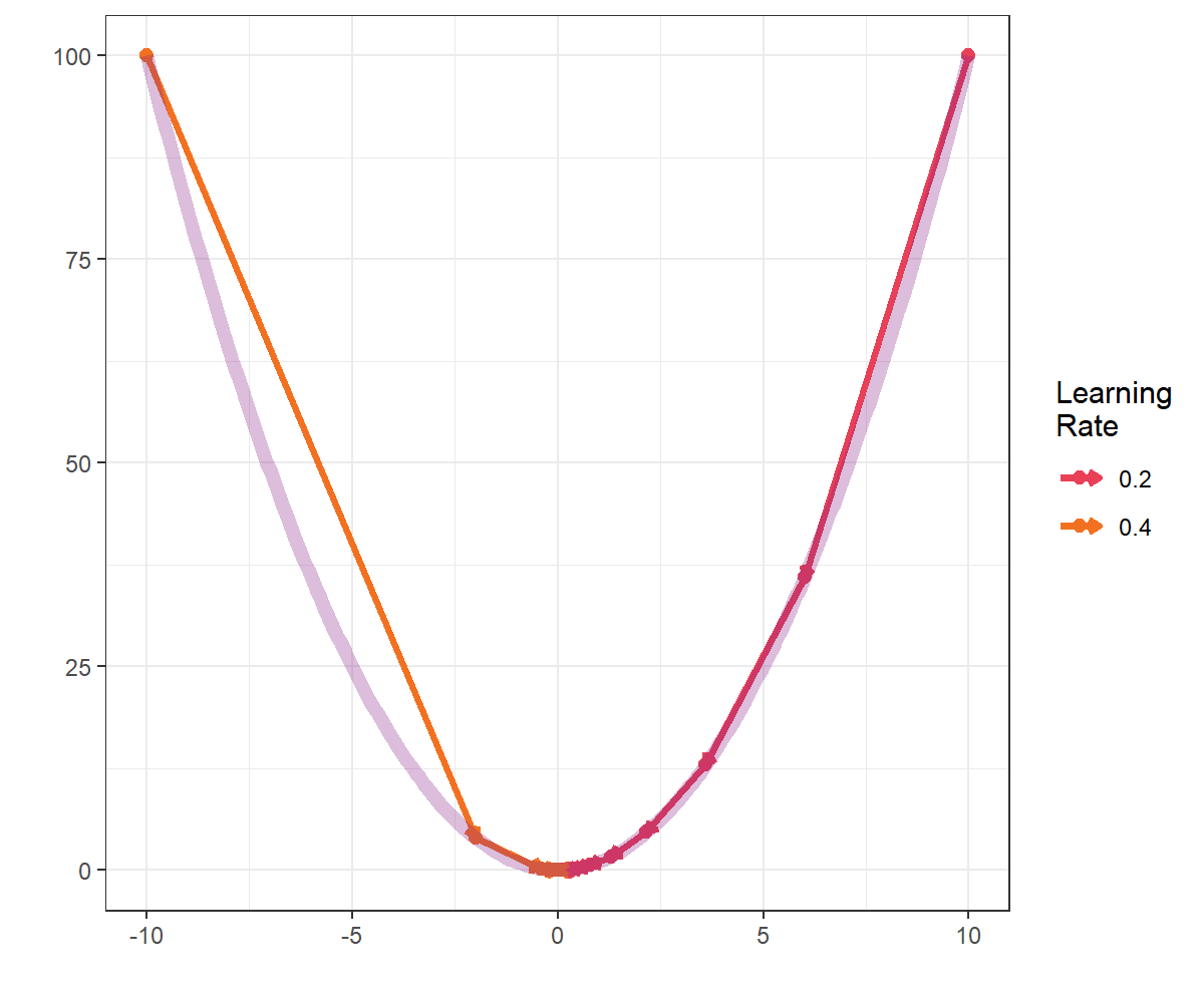 학습률 0.2, 0.4에 대하여 각각 기울기 강하법을 적용한 결과로 각각 10, -10에서 시작했습니다. 단순한 convex 함수기 때문에 학습률이 클수록 빠르게 수렴하는 것을 확인 할 수 있습니다.